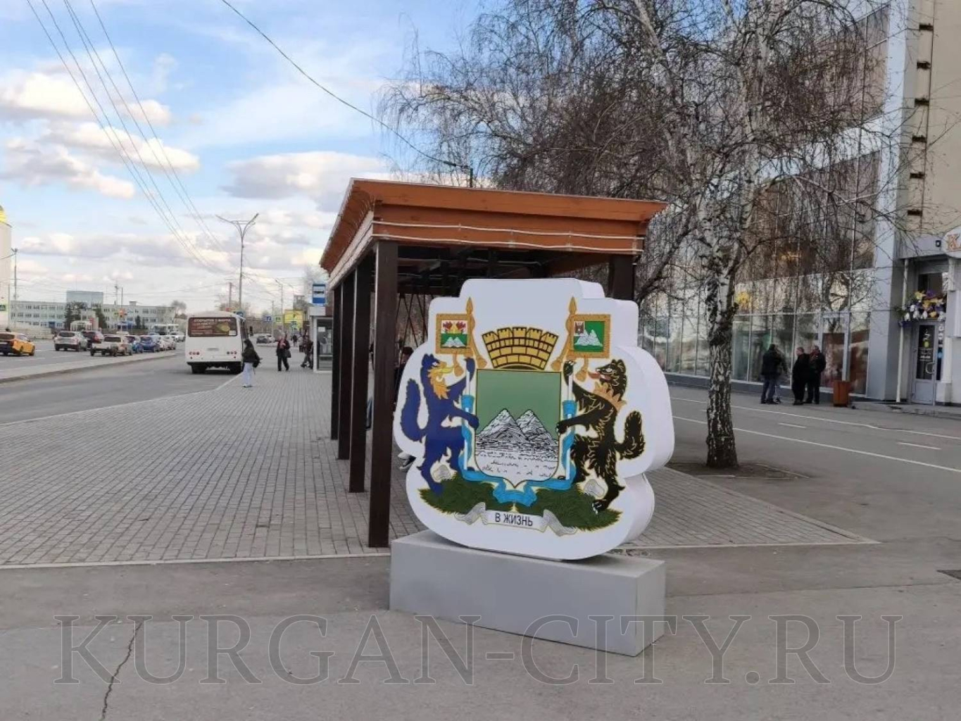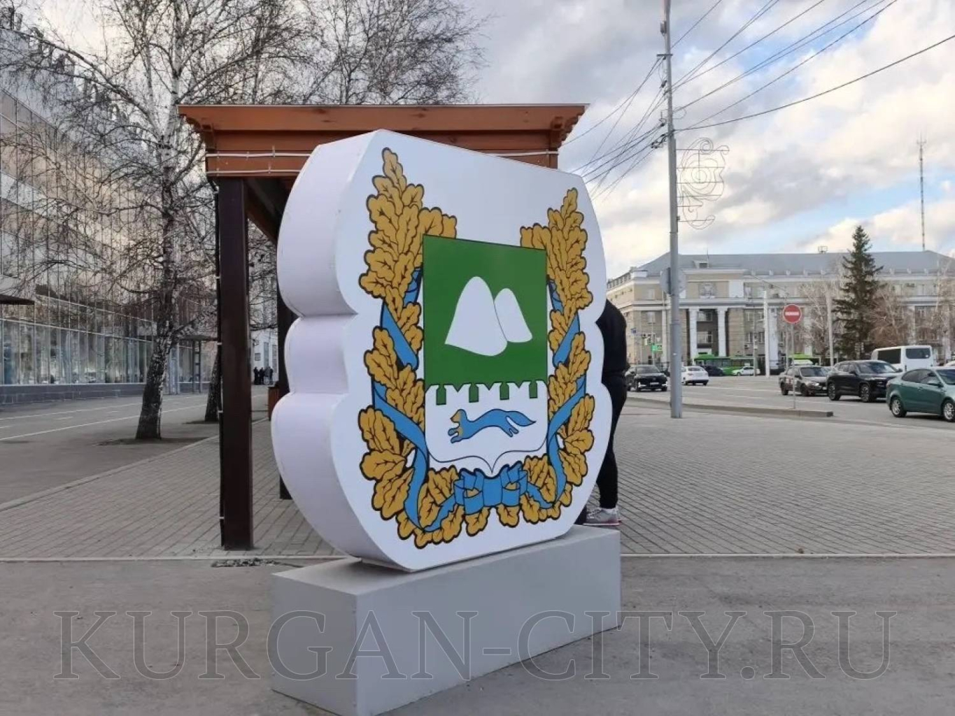 Стела с изображением герба города Кургана смонтирована на пересечении улиц Куйбышева и Ленина. Конструкция с гербом Курганской области размещена вблизи перекрестка улиц Ленина и Климова.