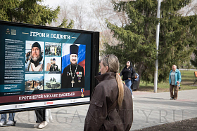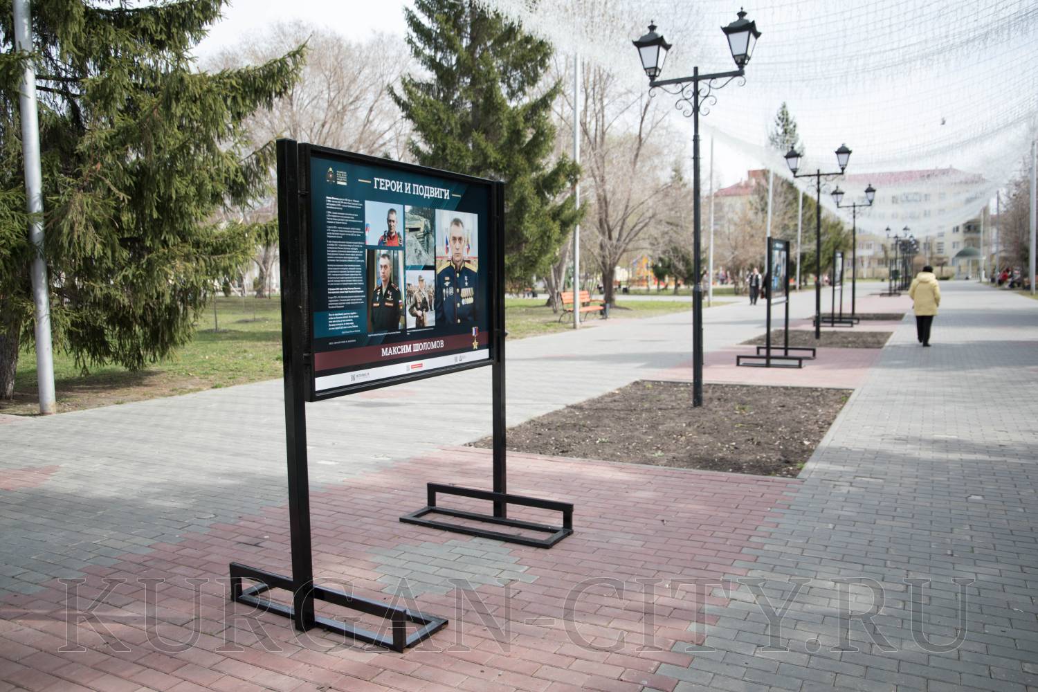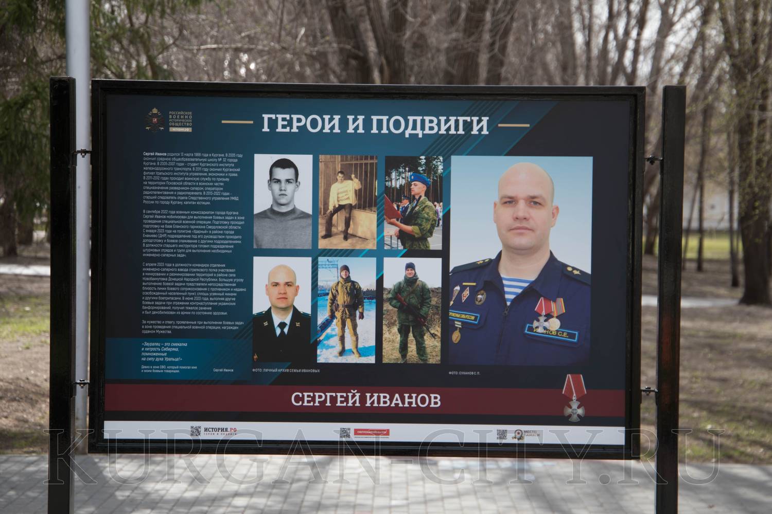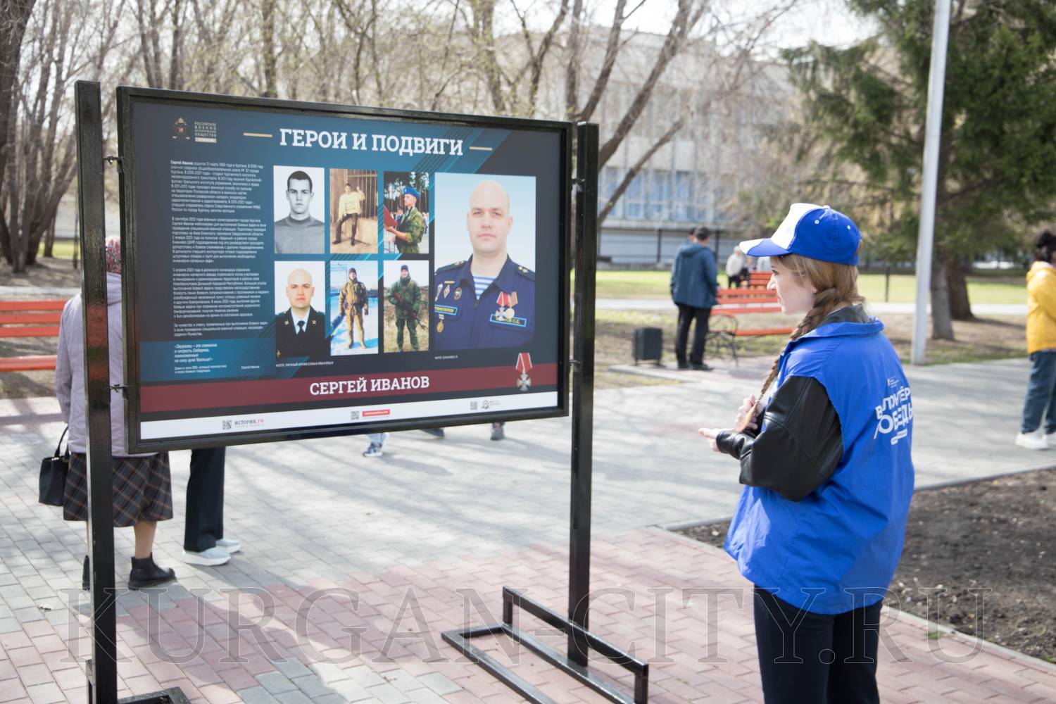 Экспозиция «Герои и подвиги» разместилась на 20 стендах и посвящена современным героям, таким, как пехотинцы Александр Матросов и Юрий Смирнов, летчики Николай Гастелло и Виктор Талалихин, политрук Клочков и снайпер Зайцев, разведчик Николай Анфиногенов и собровец Евгений Родькин. Экспозиция отражает истории жизни и подвига участников специальной военной операции, в числе которых жители города Кургана и Курганской области. Среди них уроженец села Актабан Петуховского округа Жумабай Раизов, ставший первым Героем Российской Федерации из Зауралья в период СВО.