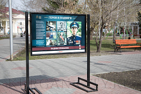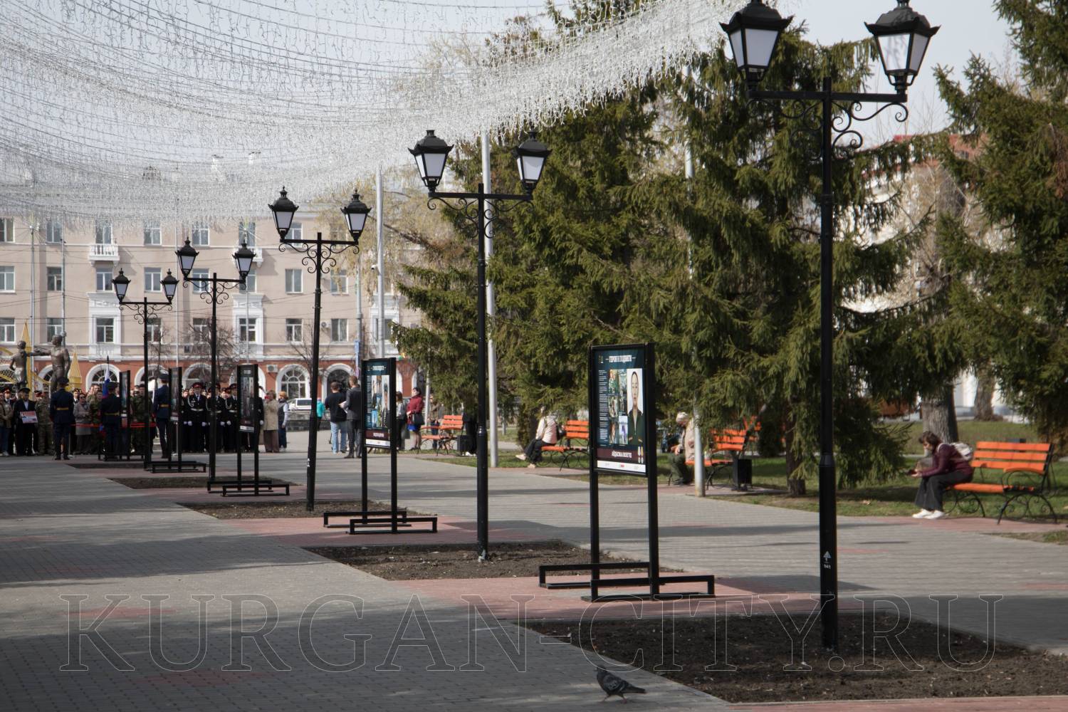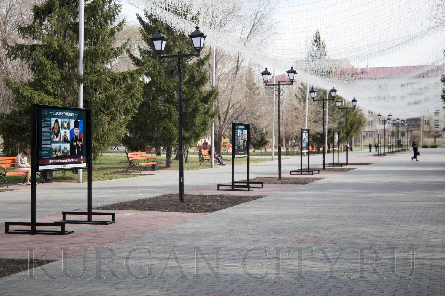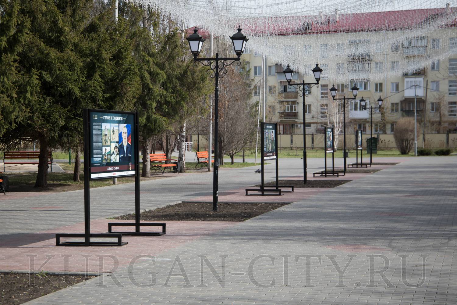 Экспозиция «Герои и подвиги» разместилась на 20 стендах и посвящена современным героям, таким, как пехотинцы Александр Матросов и Юрий Смирнов, летчики Николай Гастелло и Виктор Талалихин, политрук Клочков и снайпер Зайцев, разведчик Николай Анфиногенов и собровец Евгений Родькин. Экспозиция отражает истории жизни и подвига участников специальной военной операции, в числе которых жители города Кургана и Курганской области. Среди них уроженец села Актабан Петуховского округа Жумабай Раизов, ставший первым Героем Российской Федерации из Зауралья в период СВО.
